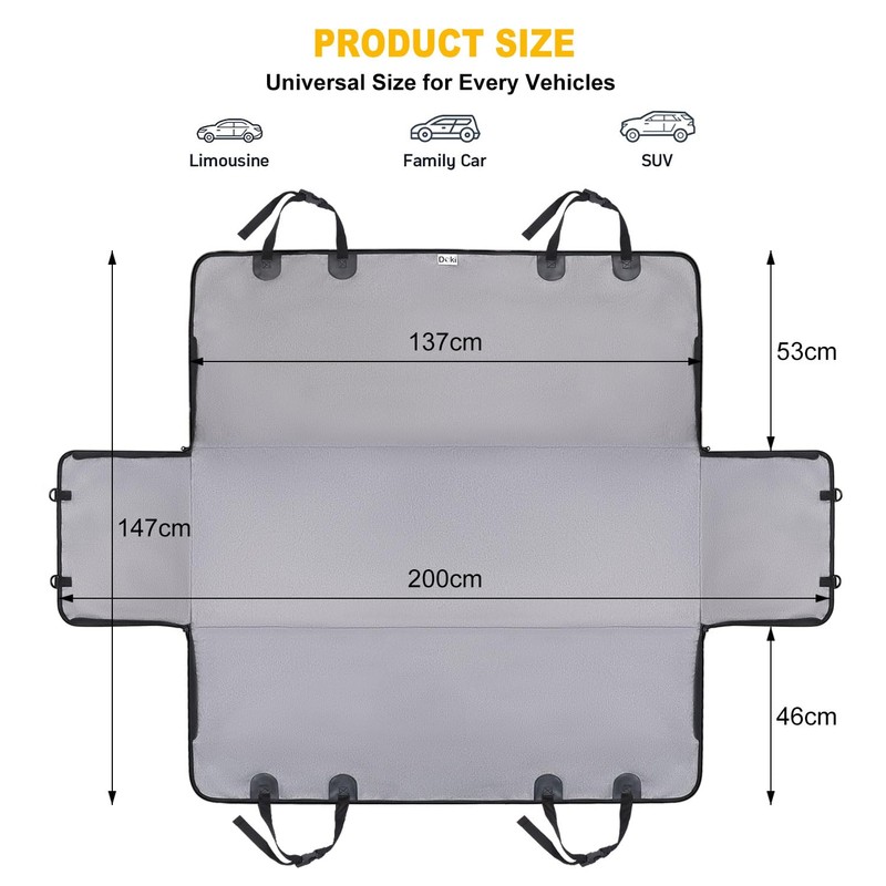 • Universal Fit: Designed to fit most vehicles, including SUVs, limousines, and family cars (137cm x 200cm). Features strong snap buckles, 3M adhesive, and Velcro fasteners for a secure and snug fit.