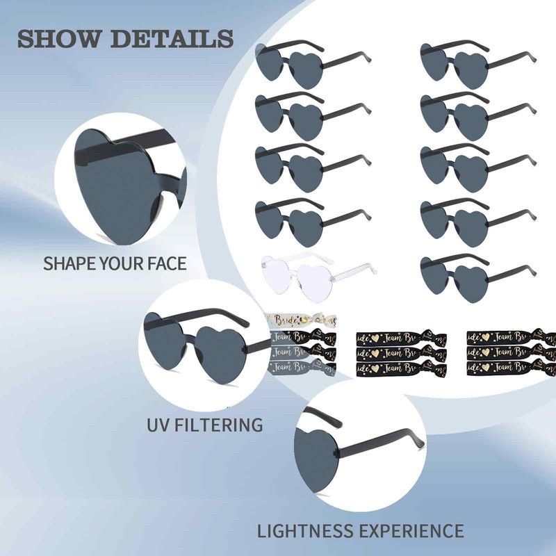 - 🩷【Bridal Shower Favors Set】- Heart sunglasses set includes 1 pair white bridal sunglasses, 9 pair black bride tribe sunglasses, 1 piece white bride hair ties, 9 pieces black bridal team hair ties, the nice combination and enough quantity can meet you and your team or friends wear, dress up needs on the wedding party, adding more charm to the party.