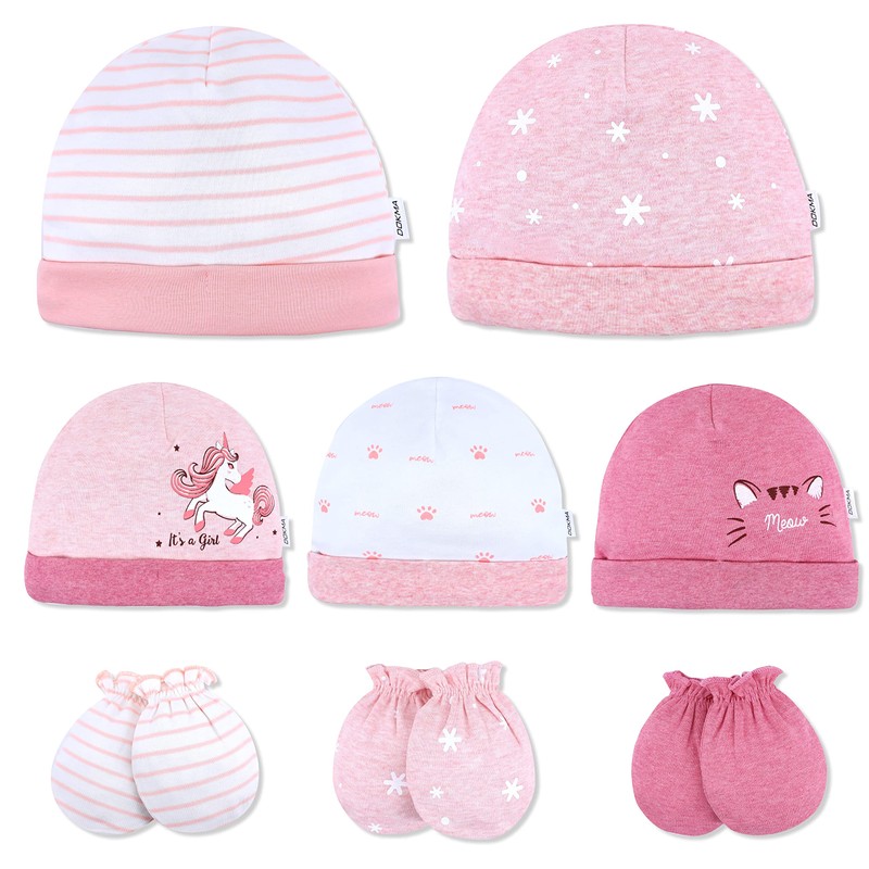 DOKMA Organic Cotton Baby Mittens and Caps Set with Cute Bunny Design for Newborn 0-6 Months -, No Scratch, Ultra Soft - 5 Caps x 3 Mittens, Pink Purple