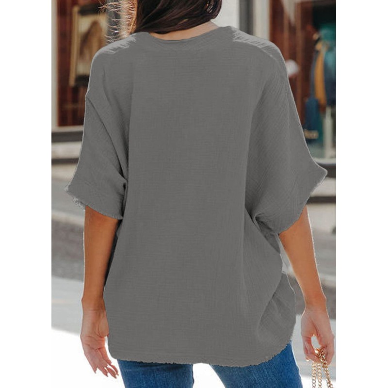 - Feature: Textured Fabrication, V-Neckline, Solid Color, Batwing Short Sleeves, Frayed Edges, Loose Fit Blouses