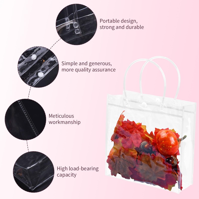 - Material de alta calidad: las bolsas de compras transparentes con asa están hechas de material de PVC transparente, reutilizables, impermeables y resistentes, con una gran capacidad de carga, los bordes están reforzados, no se deforman ni se rasgan fácilmente.