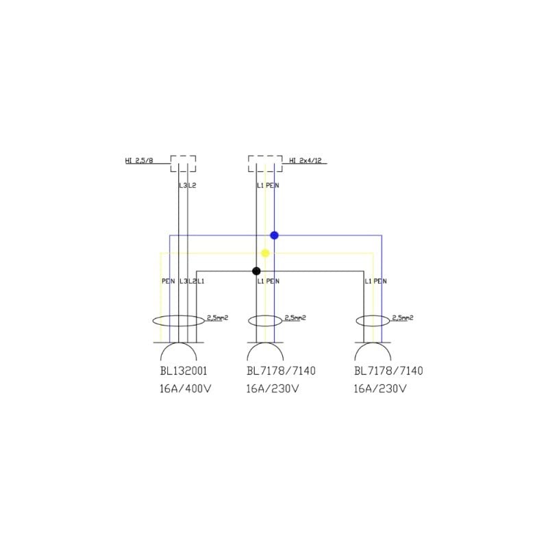 - Technical data: rated current (InA): 16A; rated voltage (Un): 400V AC; frequency: 50Hz; RDF: 0.8; number of sockets: 1x 16A/5P Quick-Connect 400V red (RAL 3000) IP44, type 132001 Bals, 2x 230V Schuko 16A/3P 2P+PE 54 Blue (RAL 5015) Type F, Type 7178 Bals.