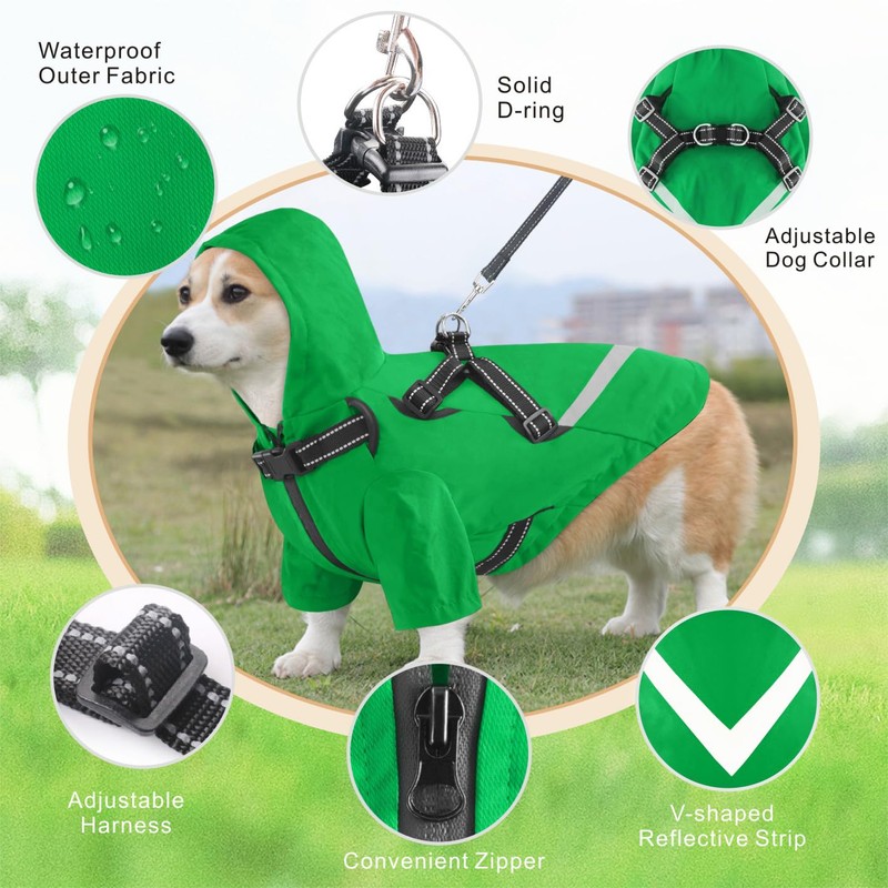 Dolahovy Dog Raincoat with Harness, Dog Ponchos Waterproof Dog Coat Lightweight Dog Rain Suit Adjustable Reflective Pet Rainwear with Hood