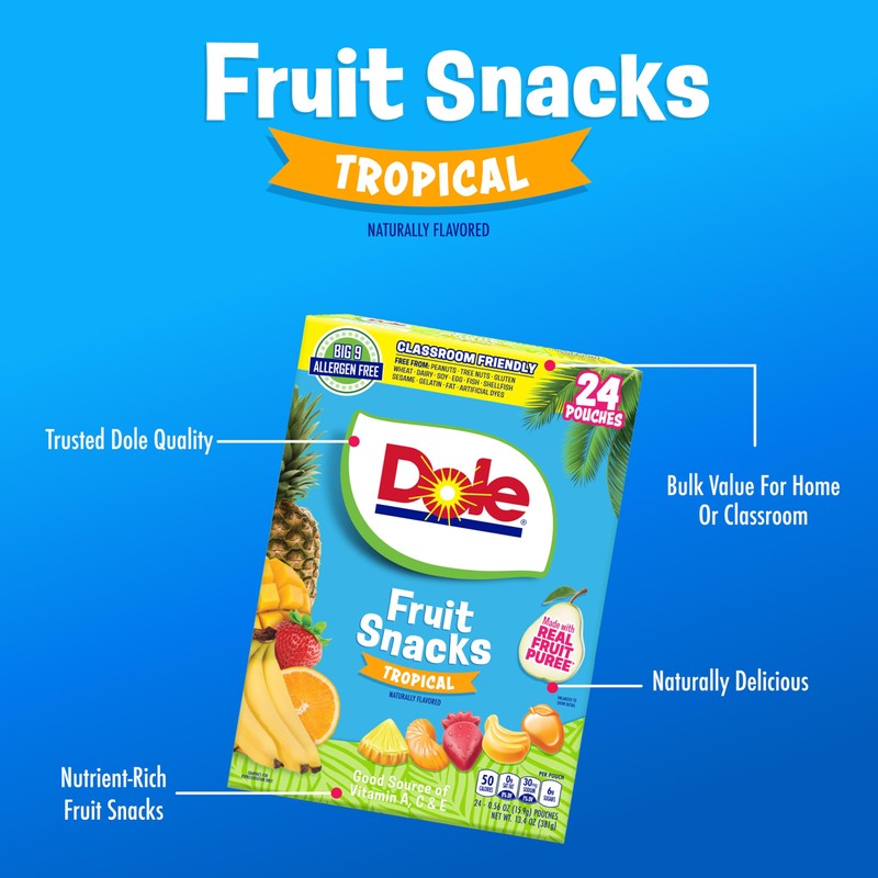 Meet the Dole Fruit Snacks with tropical flavors, the ultimate school-safe snack bursting with natural fruit flavor and clean nutrition. With 120 individually wrapped baggies (5 boxes of 24), it’s the perfect grab-and-go snack for kids, parents, and teachers alike. Made with a complete fruit purée blend from 5 fruits, these snacks are plant-based, pectin-based (no gelatin!), and packed with essential vitamins A, C & E. And here's the best part: they’re 100% free of the Top 9 allergens—making them a safe, inclusive option for classrooms, school snacks, sports snacks, lunch boxes, and busy families. Unlike typical fruit snacks, Dole skips the artificial dyes and genetically modified fillers. No modified corn starch, no hormone-disrupting colors—just natural ingredients, colored and flavored by nature. Kids love the juicy tropical taste, and parents love the clean label. From the brand that’s synonymous with fruit, Dole Fruit Snacks are your go-to for snacks that deliver on flavor, safety, and nutrition. Tasty. Sweet. School-Approved.