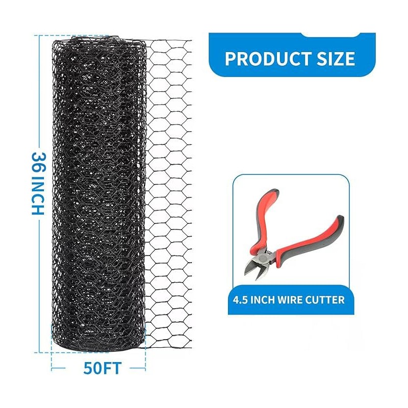 • » » Durable Material : Our black hexagonal wire mesh roll is made with black vinyl coated fence wire, specially treated and hot-dip galvanized, with excellent weather resistance and corrosion resistance. Double twist braid keep it sturdy,more durable than nylon or plastic poultry mesh netting.