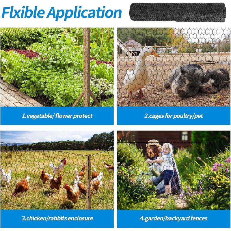 - » » Multi-functional Application: The multi-functional design of black hexagonal wire mesh makes it suitable for a variety of places and uses. It can be used as a fence for farmland, orchards, gardens, etc.It is lightweight and easy shaping , perfect for DIY projects in various shapes. In addition, it can also be used to make animal cages, breeding equipment, flower racks, etc,to meet the needs of different users.