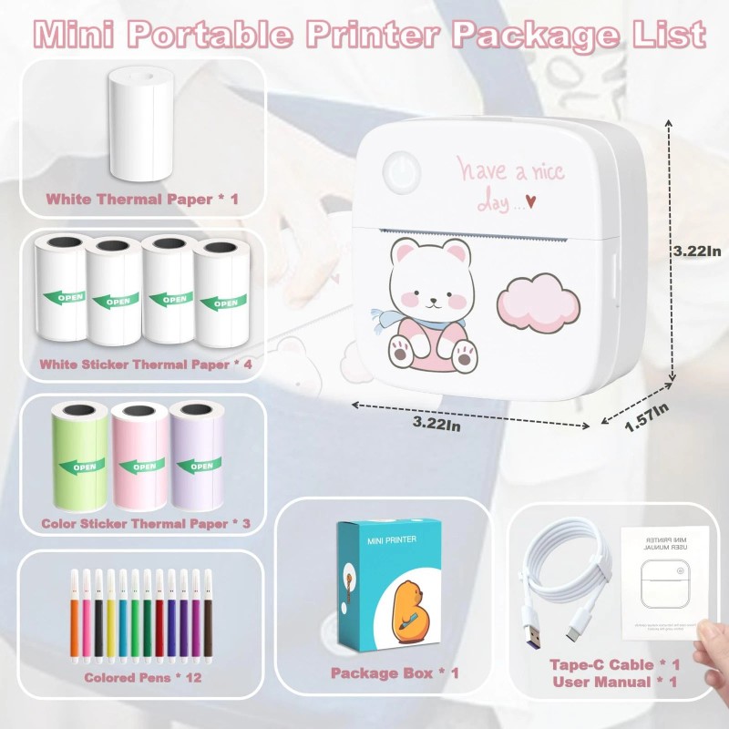 [Cost-Effective Gift Pack]→The mini thermal printer complete elete kit comes with 8 rolls of paper (1 * thermal receipt paper, 4 * sticker paper, 3 * colored sticker paper , 12 * colored pens), 1 * Type-C cable, 1 * user manual. Unlike other printers, the portable mini printer utilizes thermal imaging technology, it eliminates the need for toner, ink, and ribbons. This pocket printer only requires environmentally friendly thermal paper. The little small printer serves as a money saving/spac-saving/time-saving companion
