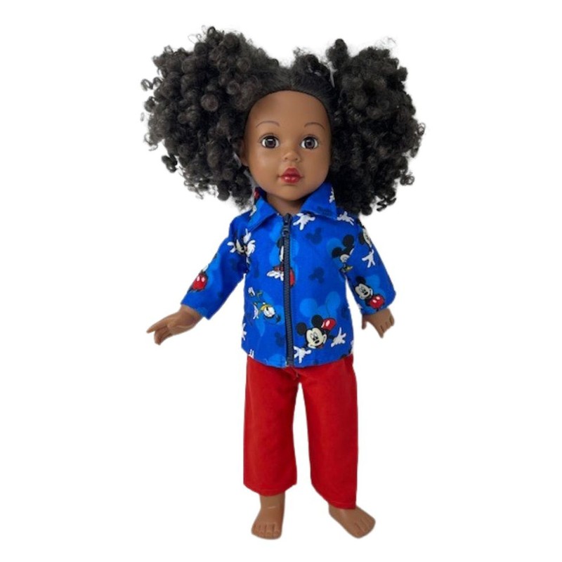 - Enhance your doll's wardrobe with our charming Mickey Print Jacket and Coordinating blue Pants set