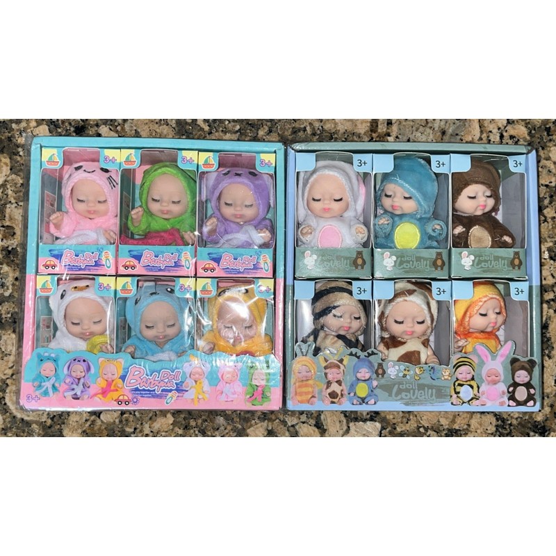 For sale is a set of 12 mini sleeping baby dolls, each measuring 4 inches in length. These reborn animal costumed individual dolls come in a cute box and feature gender-neutral characters with light complexions and eyes closed. The set includes 2 six-piece boxes of dolls with animal costumes, packaged individually. Perfect for new baby showers, special occasions, birthdays, party favors, stocking stuffers, these dolls are part of the Doll Lovely and Barbywa franchise and are a part of the Animal Costume Dolls series. This original product line offers adorable and unique baby dolls in a variety of animal costumes.