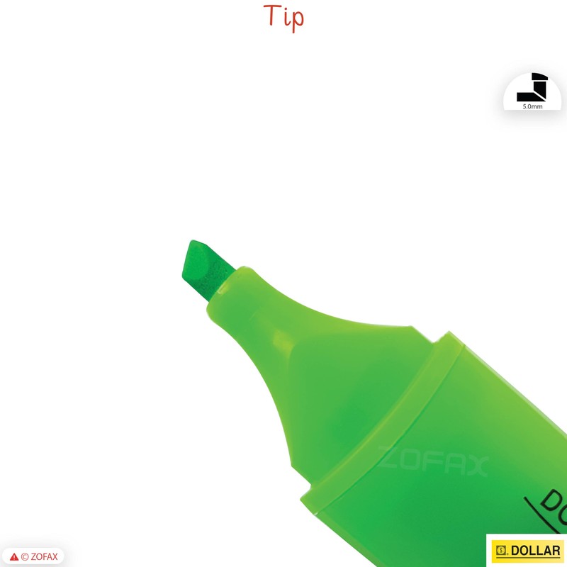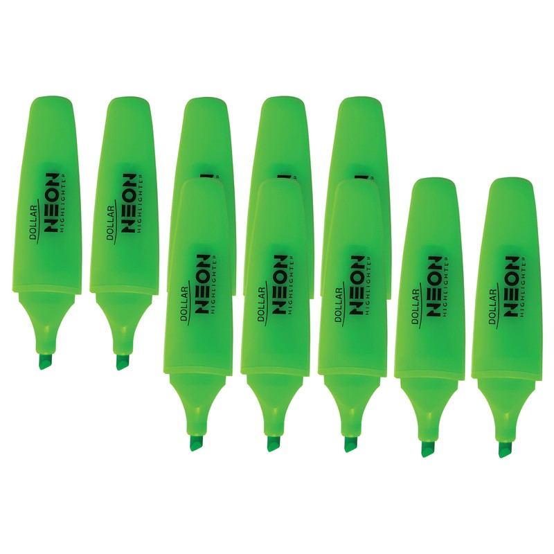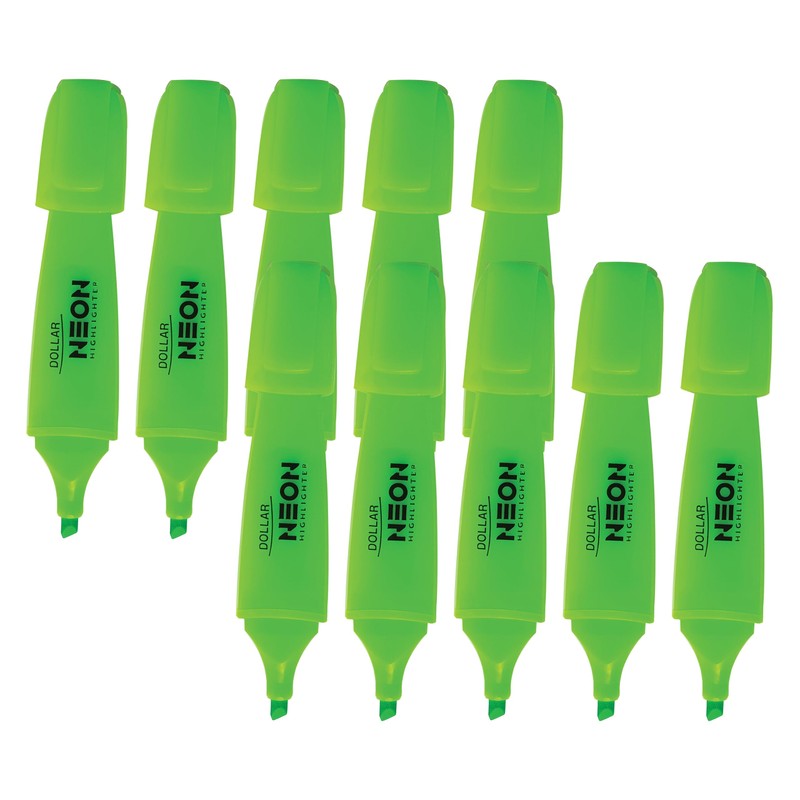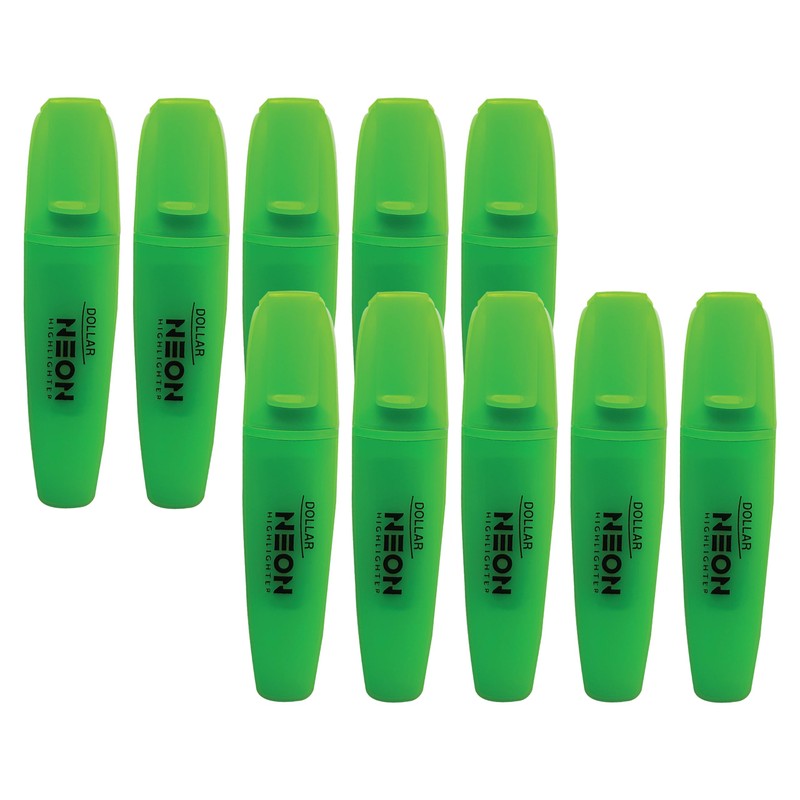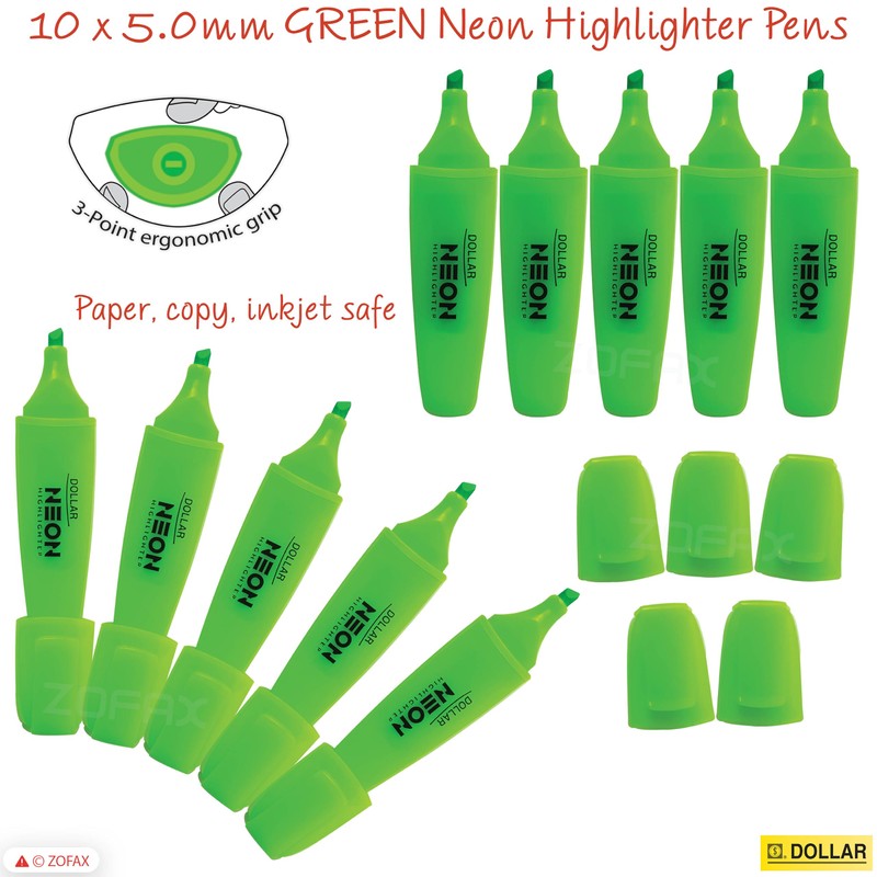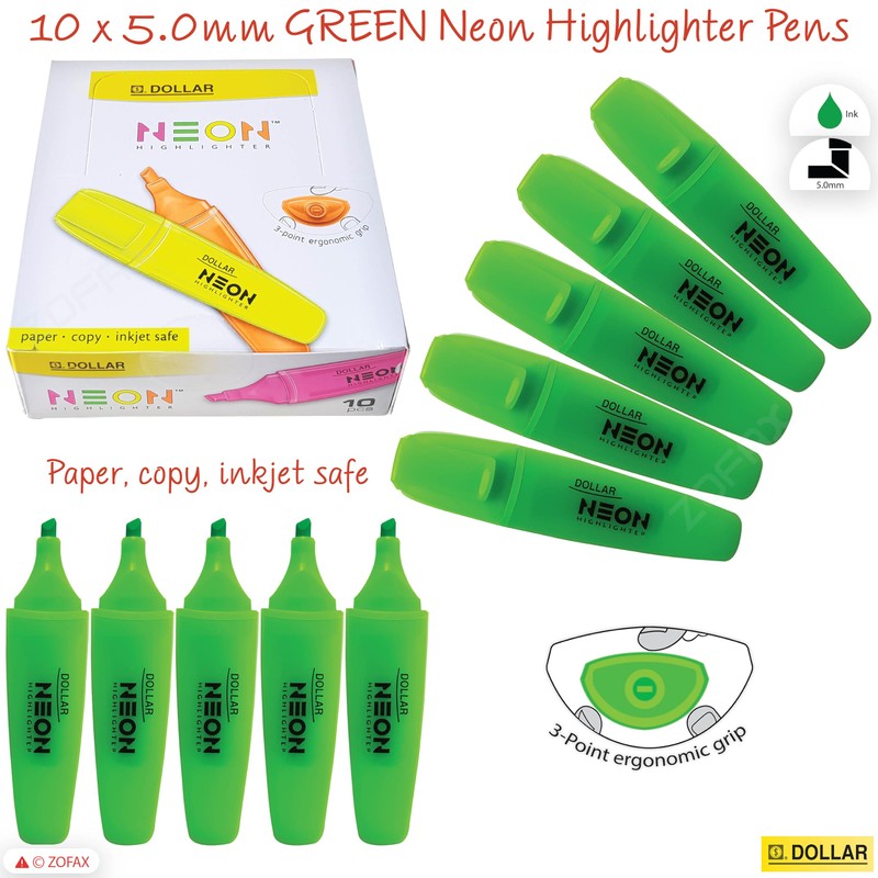 DOLLAR HL625 Neon Fluorescent Highlighter Pens, GREEN, Pack of 10, Chisel Tip (5.0mm), 3-Point Grip, Multipack, Fast-drying, School Office Home Highlighters