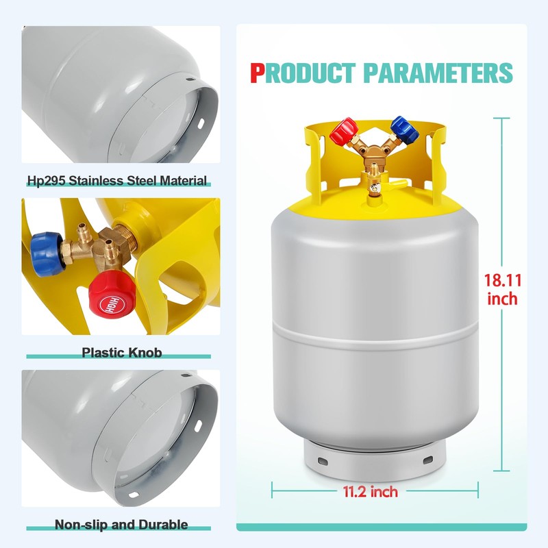 - R410A Refrigerant Tank: It can recover many kinds of refrigerants such as R12, R22, R134A, R410A and so on. It can be used with refrigerant recovery machine to store R410A refrigerant.