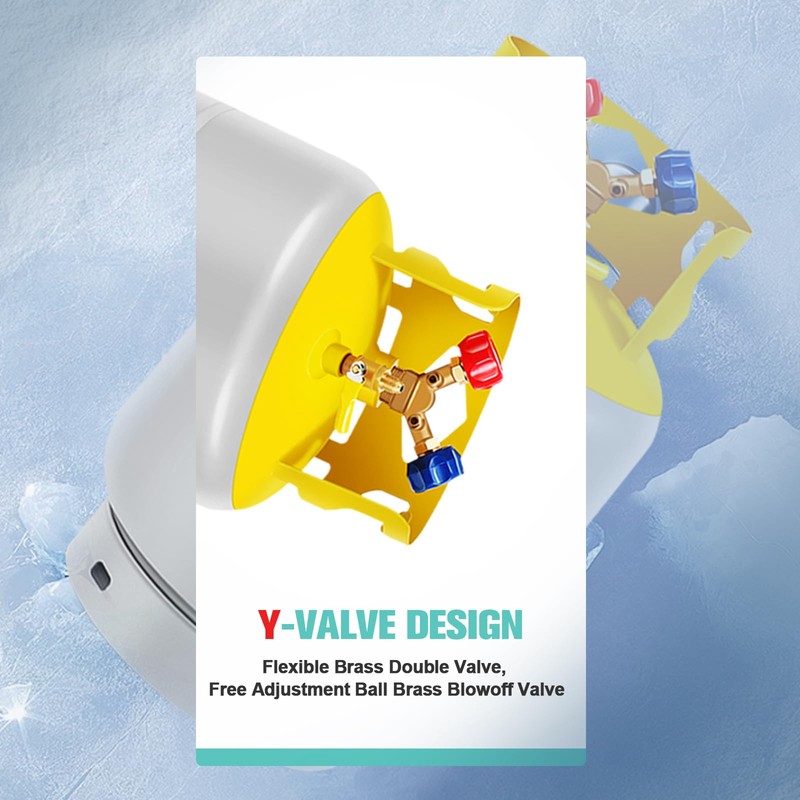 - Y-Valve Design: HVAC recovery tanks feature a Y-valve design with a brass ball valve that is freely adjustable; a plastic knob that is non-slip and durable; and a collar-shaped handle that is easy to grip and move for improved efficiency.