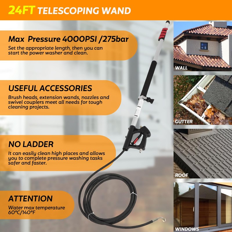 - Telescopic Design: Featuring an adjustable telescopic design that extends from 5 to 24 FT, this telescoping pressure washer wand allows you to reach higher areas with ease. The lever lock mechanism ensures secure height adjustments, enhancing the flexibility of your cleaning operations.