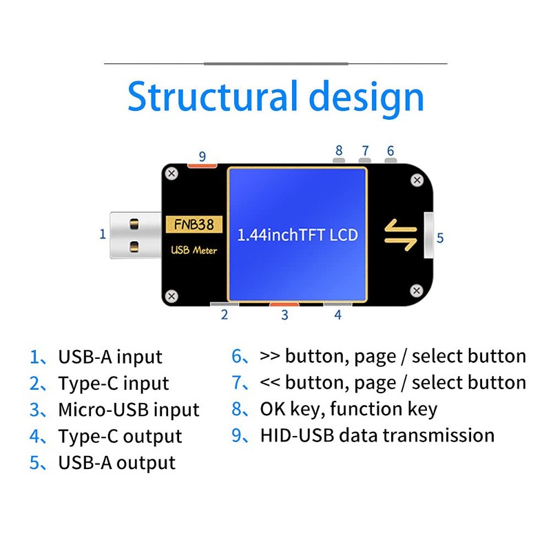 • USB 2.0 interface, 1.44 inch TFT LCD high definition display with built-in USB-A, micro USB, Type-C interfaces, use external 16-bit ADC, PD protocol physical chip.