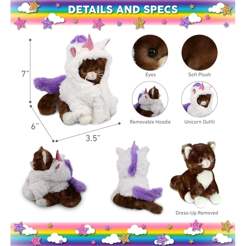 - INCLUDED WITH THE PURCHASE - Includes 1 DolliBu Plush Brown Cat Unicorn Plush measuring 6Lx3.5Wx7H inches. The Catcorn plush fantasy comes with a removable white unicorn costume with a sparkling pink horn and ears embedded with glitter, and removable hoodie. Then, for additional cost, you have the option to add a Gift Bag, a Tissue Paper, a Greeting Card, and even personalize it with a name.
