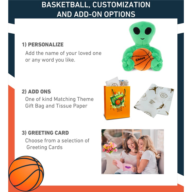 - PERSONALIZATION, CUSTOMIZATION, AND ADD-ON OPTIONS - Super Soft Sports Stuffed Animal Green Alien comes customized with a Basketball Plush. You can personalize it with the name of your loved one imprinted on the item. You also have the option to add some or all of the cool add-ons to make your gift extra special: 1) Gift Bag; 2) Tissue Paper; 3) Greeting Card.