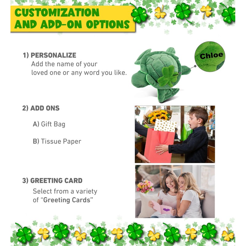- PERSONALIZATION, CUSTOMIZATION, AND ADD-ON OPTIONS - This Sea Turtle Plush comes with a custom Green Plush Shamrock. You can turn into a personalized stuffed animal for girls or boys by adding the name of a loved one or any word that we will imprint on the item. You also have the option to add some or all of the cool add-ons to make your gift even more special: 1) Gift Bag 2) Tissue Paper 3) Greeting Card.