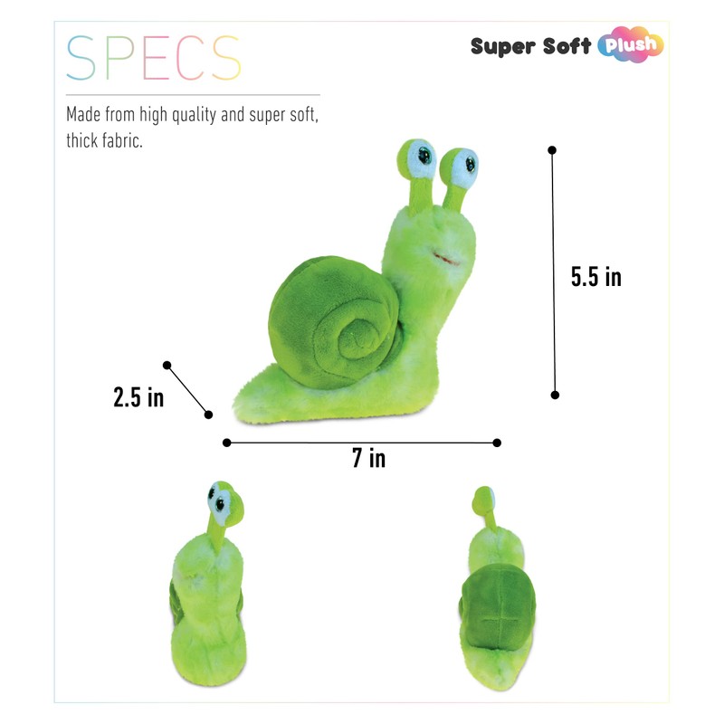 - HIGH-QUALITY SNAIL STUFFED ANIMAL FOR GIRLS - The machine-sewn snail toy is made of premium-quality super soft 100% polyester. Beautifully crafted with durable, child-friendly snail features. Huggable, snuggly plush baby toys snail in a cute standing position. Super soft stuffed animals for girls and boys designed to be your little one's best buddy. To maintain fluffy stuffed animals, wash snail plush with cold soapy water and allow to air dry.