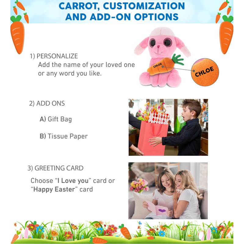 - PERSONALIZATION, CUSTOMIZATION, AND ADD-ON OPTIONS - Sparkling Eyes Pink Poodle Dog comes customized with a stuffed carrot toy. You can turn it into a personalized stuffed animal with the name of a loved one, or add any word which we will imprint on the item. And last, you have the option to add some or all of the cool add-ons to make your gift extra special: 1) Gift Bag 2) Tissue Paper 3) Greeting Card.
