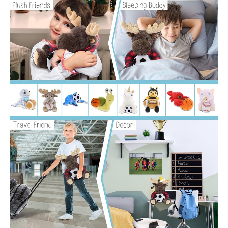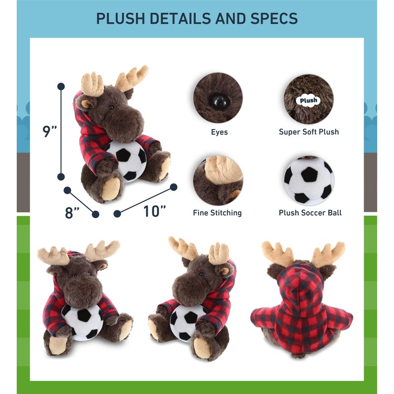 • INCLUDED WITH THE PURCHASE OF ADORABLE CUTE MOOSE PLUSH - Includes 1 DolliBu Sitting Moose Super Soft Plush with a Soccer plush, decorated with realistic features of cute plush Moose. The Moose body with a sports gift ball plush and red plaid hoodie makes the plush perfect for cuddles. The Moose plush toy features details like its horns. The Moose eyes make the critter so charming. The cute plush toy buddy measures 10Lx8Wx9H inches.