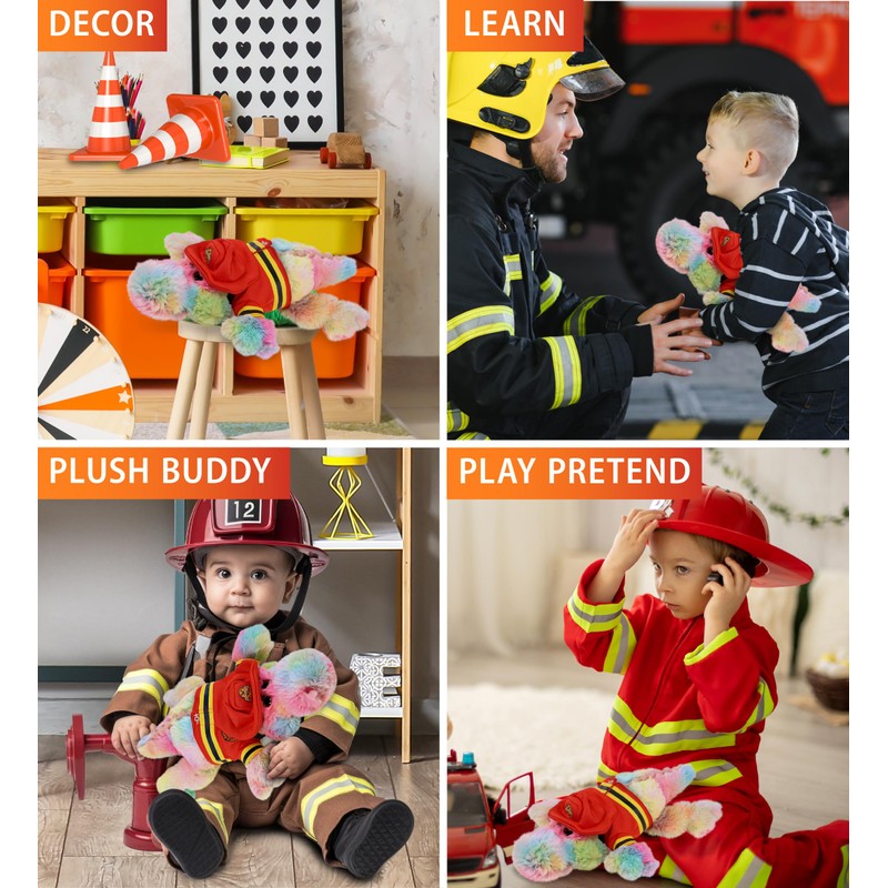 • INCLUDED WITH THE PURCHASE OF FIREFIGHTER DOLL - Includes 1 rainbow alligator plush with fireman plush animal outfit. The alligator is dressed in a realistic firefighter outfit with a hat, jacket, pants with yellow and black stripes, and the fire dept. patch. Pair your firefighter plush with your firetruck plush toy for a fun pretend play. Each fire fighter toys' measures 12LX9WX3H inches. Ideal fireman kids stuffed animal age 3 and up.