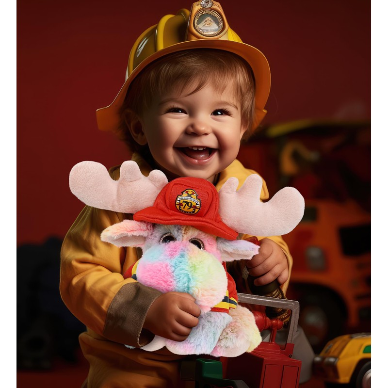 - THE MOOSE FIREFIGHTER PLUSH IS FOR EVERYONE WHO LOVES FIREMAN TOYS - Rainbow Floppy Moose fireman plush toy will fire your kid's imagination about the heroic acts of a firefighter with its firefighter design. A realistic fireman costume makes it the ideal firefighter stuffed animal for kids and adults. Inspire kids to dream of being a brave firefighter with fire fighter toys. The firefighter doll makes the perfect gift for the future fireman.