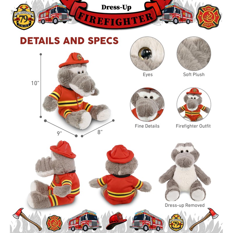 - INCLUDED WITH THE PURCHASE OF FIREFIGHTER DOLL - Includes 1 sitting grey alligator plush with fireman plush animal outfit. The alligator is dressed in a realistic firefighter outfit with a hat, jacket, pants with yellow and black stripes, and the fire dept. patch. Pair your firefighter plush with your firetruck plush toy for a fun pretend play. Each fire fighter toys' measures 8Lx9Wx10H inches. Ideal fireman kids stuffed animal age 3 and up.