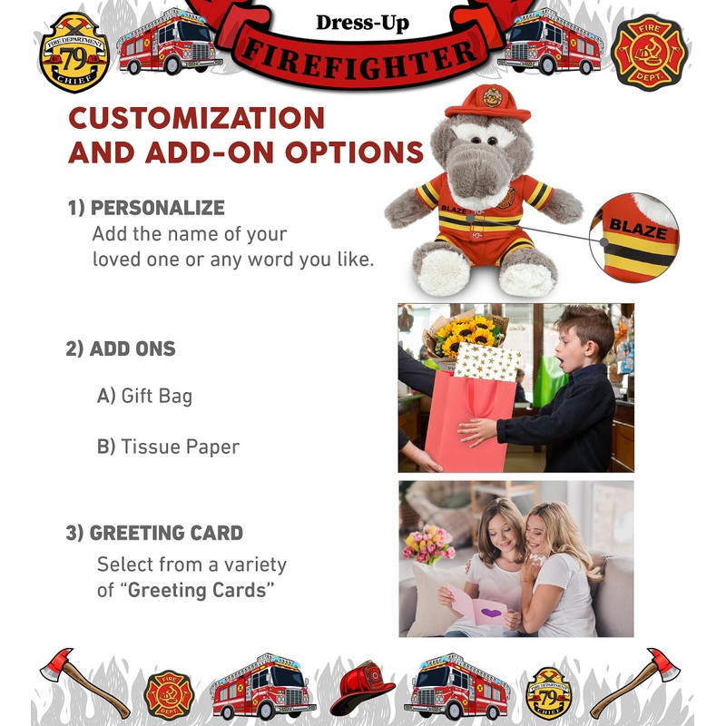 - PERSONALIZATION, CUSTOMIZATION, AND ADD-ON OPTIONS - Sitting Grey Alligator firefighter plush features a red fireman toy costume wearing a firefighter hat, jacket, and pants. Personalize your plush firefighter toys with the name of your loved one, which we will imprint on the item. You also have the option to customize your fireman plush by adding some or all of our cool add-ons to make it special: 1) Gift Bag 2) Tissue Paper 3) Greeting Card.