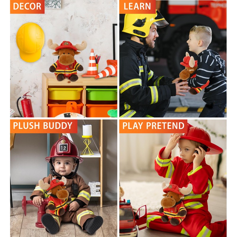 • THE MOOSE FIREFIGHTER PLUSH IS FOR EVERYONE WHO LOVES FIREMAN TOYS - Moose fireman plush toy will fire your kid's imagination about the heroic acts of a firefighter with its firefighter design. A realistic fireman costume makes it the ideal firefighter stuffed animal for kids and adults. Inspire your kids to dream of being a brave firefighter with fire fighter toys. The firefighter doll makes the perfect gift for the future fireman.