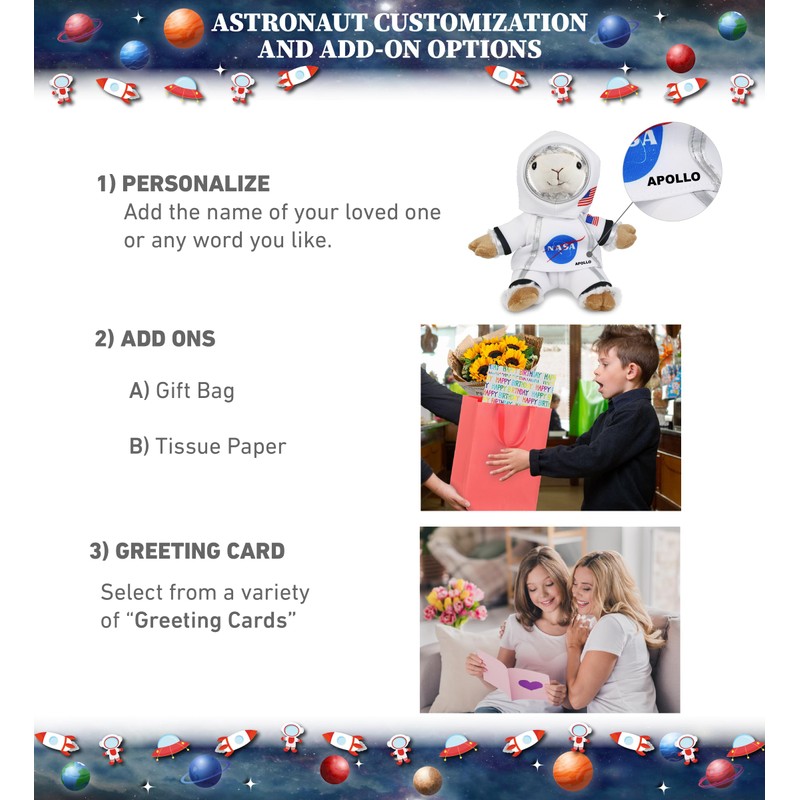 - PERSONALIZATION, CUSTOMIZATION, AND ADD-ON OPTIONS - The Squat Sheep features an Astronaut outfit, with a space helmet and a NASA astronaut outfit with a printed USA flag. Personalize it by adding the name of your loved one, which we will imprint on the item. You also have the option to customize your astronaut plush by adding some or all of our cool add-ons to make it extra special: 1) Gift Bag 2) Tissue Paper 3) Greeting Card.
