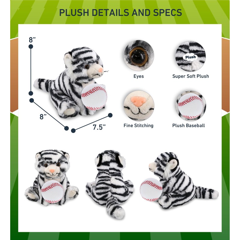 - INCLUDED WITH THE PURCHASE OF TIGER PLUSH WITH BASEBALL BALL - Includes 1 DolliBu Squat White Tiger Super Soft Stuffed Animal with a baseball plush, decorated with realistic features of a tiger. The baseball sports ball is attached to the tiger body, making it perfect for cuddles. The tiger plush toy features realistic details. The tiger eyes make the critter so charming. The cute plush toy buddy measures 7.5LX7.5WX8H inches.