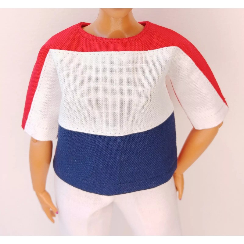 Stylish doll outfit featuring a modern, color-block design. The ensemble includes a top with red, white, and blue sections and matching white pants. The top boasts a clean, straight silhouette with short sleeves and a vibrant red stripe running down the sides. The pants are tailored for a snug fit, perfectly complementing the top. Ideal for collectors or as a fashionable addition to your doll's wardrobe.