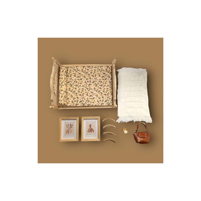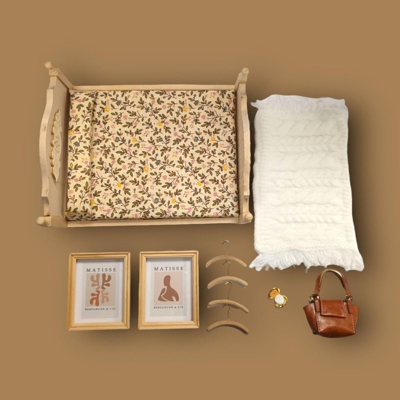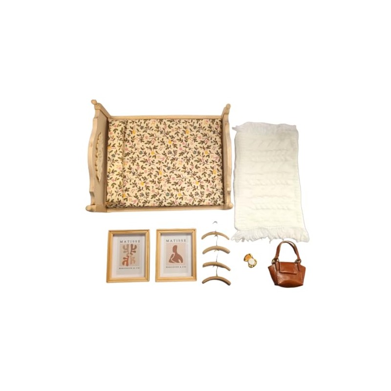 Dolls House Modern Bedroom Accessory Pack, Includes Coat Hangers, Pictures, Throw Rug, Compact, Handbag and Double Bed | Minimum World