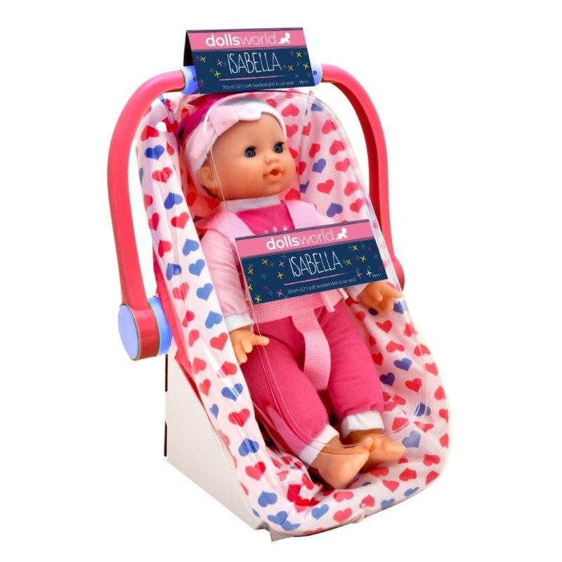 - ISABELLA: A 30cm (12") soft bodied doll with sleeping eyes, complete with rocking baby car seat with adjustable carry handle.