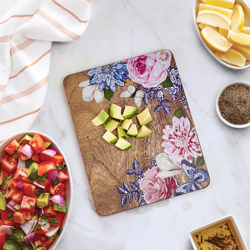 - COOK WITH DOLLY: Featuring delicate designs of flowers and butterflies, this cutting board brings the dazzling energy and sparkling style of this iconic singer to your kitchen.