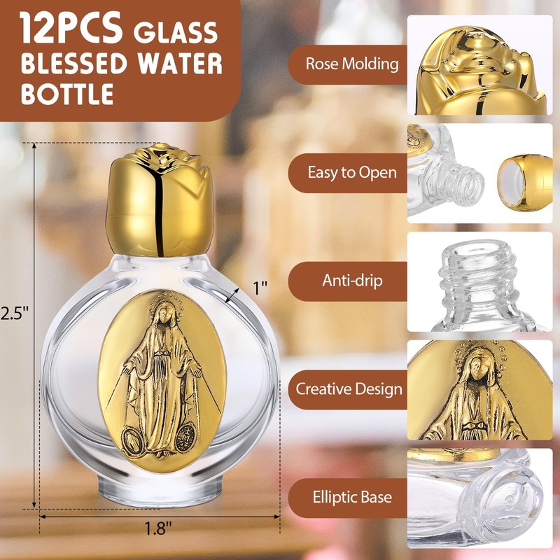- Clear Glass Bottle: small gold water bottle can be applied to store holy water or other liquids, fill essential oil bottles, portable perfume bottles; 12 decorative bottles can meet different needs in your daily life; Holy water bottle with gold cap and gold virgin mary devotional; When you use it, the beautiful appearance will make you more elegant and charming