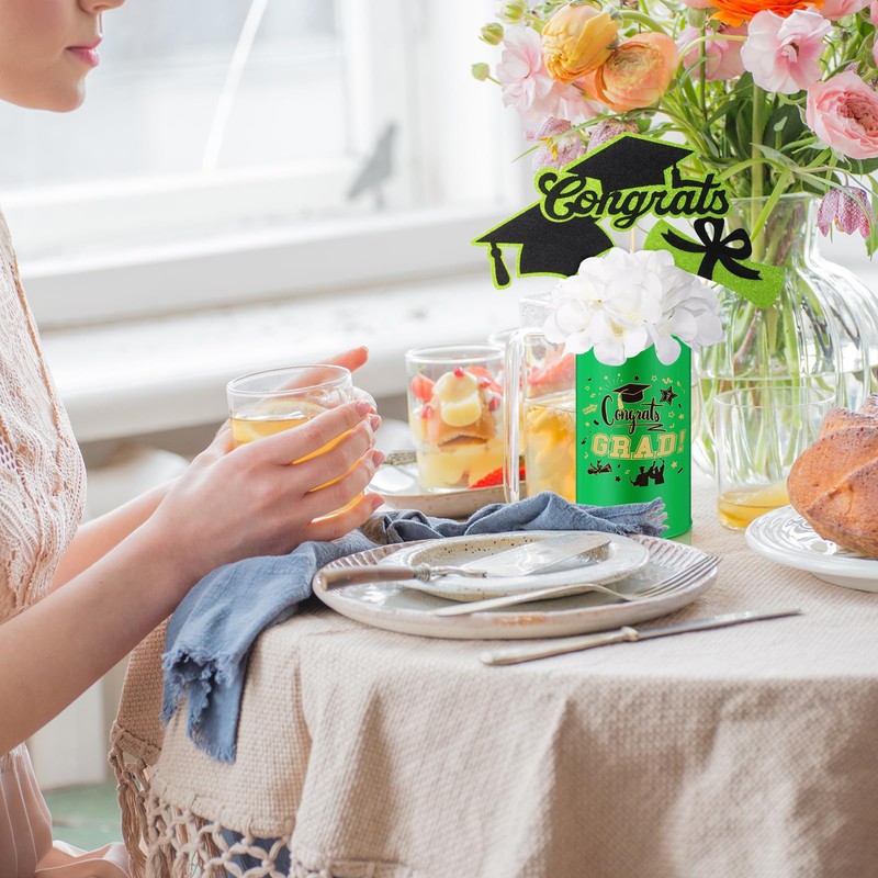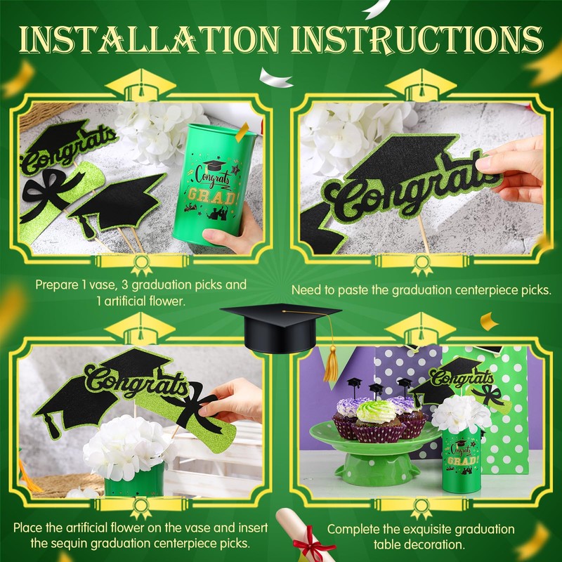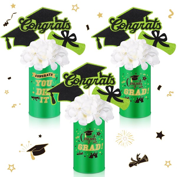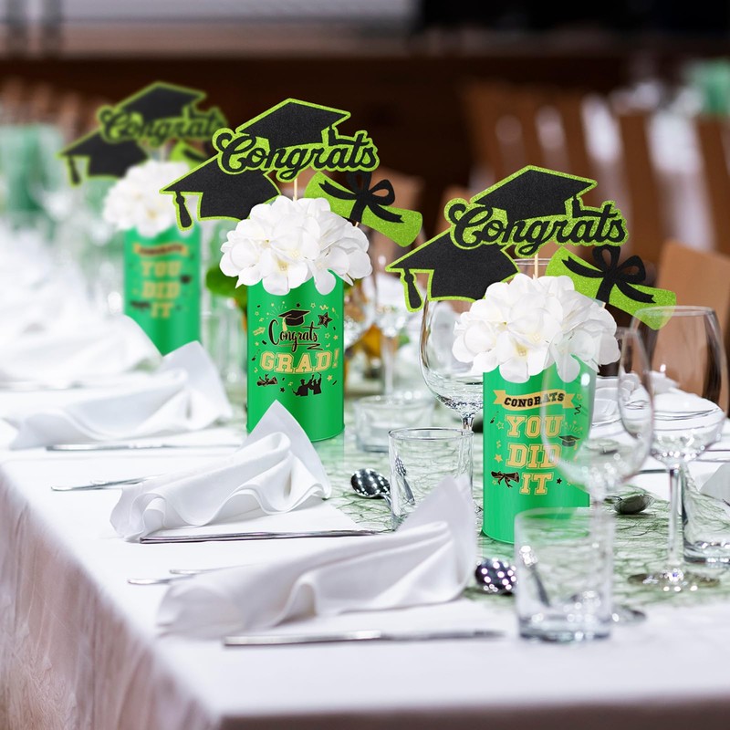 - Stylish Graduation Theme Design: displaying a stylish and eye-catching combination of green, black and gold, our graduation theme 2025 center vase features doctoral cap elements, embellished with stars and graduation certificates, and graduation encouragement words such as "Congrats" and "YOU DID IT"; It is very attractive and exudes elegance and sophistication, ideal matching the graduation theme; Add a chic upgrade to your party