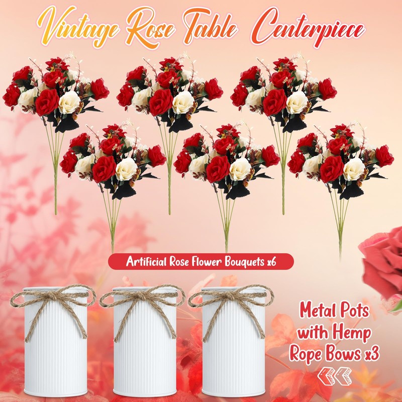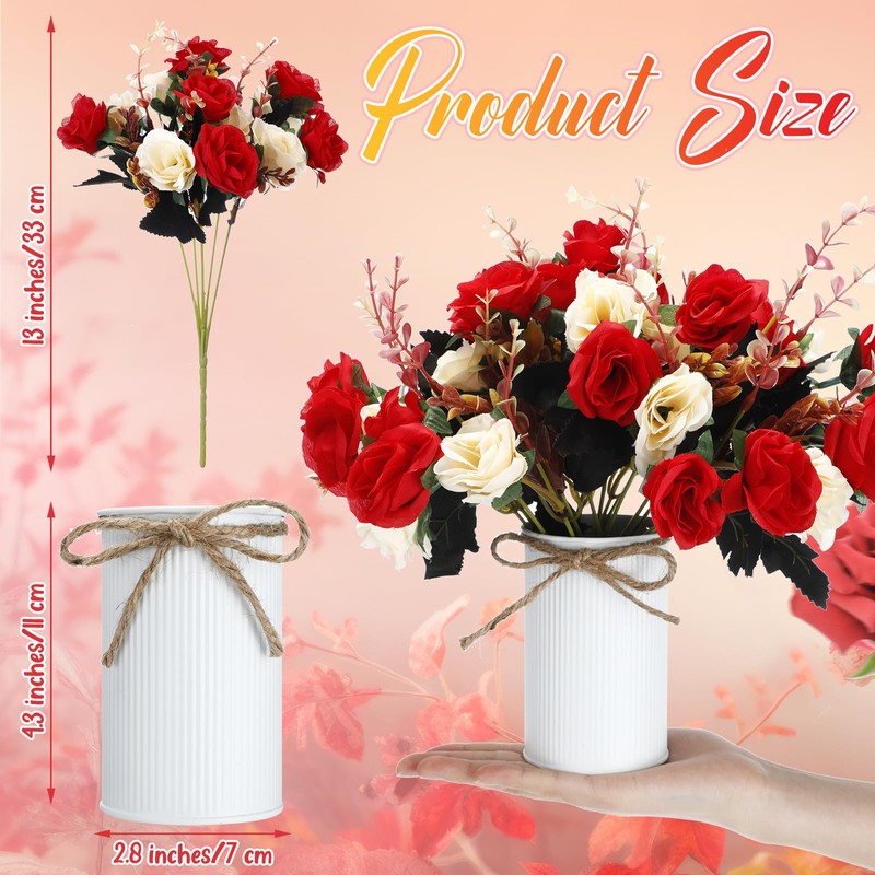 The metal pots measure about 2.8 x 4.3 inches/ 7 x 11 cm, each rose flower bouquet size is about 13 inches/ 33 cm. These Silk Rose Flowers make an ideal table centerpiece. The size of each flower bouquet beautifully complements the metal pot, creating an aesthetically pleasing display that will catch everyone's eye.