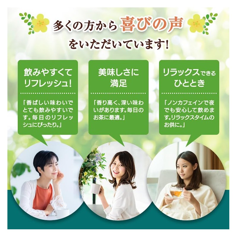 Caffeine: This product is caffeine free, so you can enjoy it anytime without any hassle. This tea is safe for those who want to refrain from caffeine or even at night. Suitable for people of all ages, from children to elderly, especially for pregnant women.