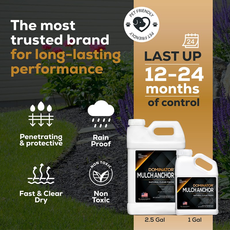 - WORRY FREE LANDSCAPING - Mulch Anchor is water permeable, non-toxic, safe for pet paws, and its strong, water-based formula won't harm your plants.