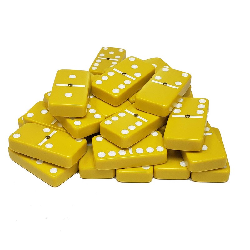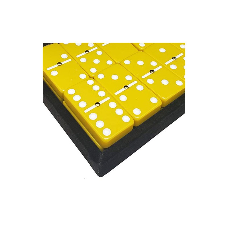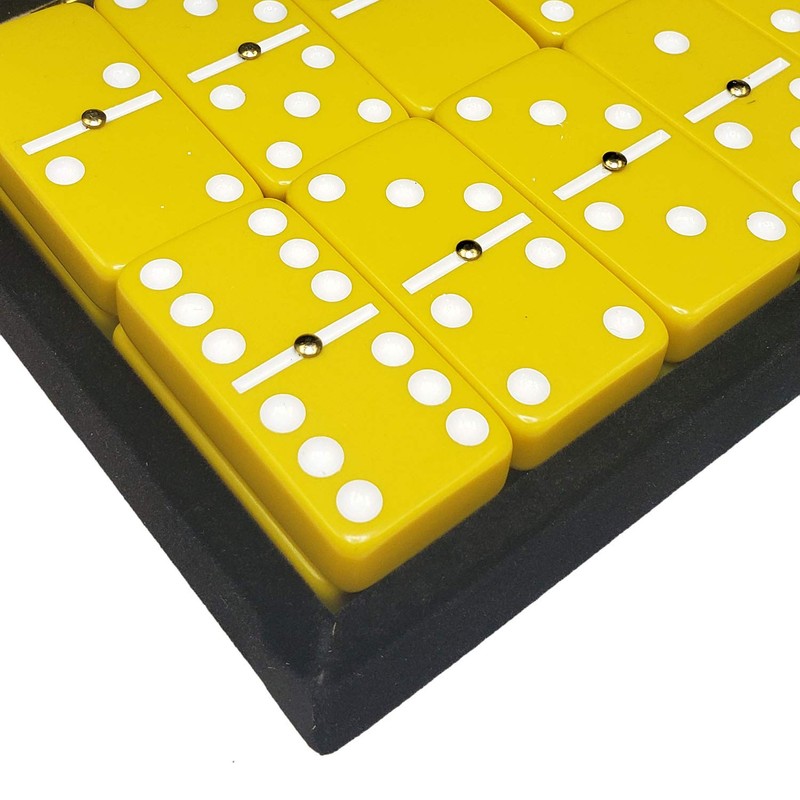 This Double Six Set of Dominoes (28 Tiles with Spinners) comes in Yellow with White spots. Tournament Jumbo Size (2" X 1" X 1/2"). The set is packaged in an Elegant Black Velvet Box.
