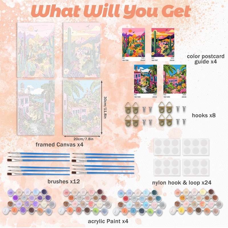 DOMROM Paint by Number for Adults Framed Canvas, 4 Pack Paint by Number Kits Pink Landscape Arts for Beginner, Easy DIY Desert Cactus Seaside Town Acrylic Painting Number Kits for Home Decor(8X12in)
