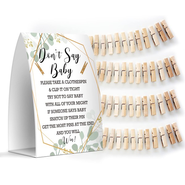 - Our Don't Say Baby set contains 50 natural mini wooden clothespins, enough for every guest to participate in the game.