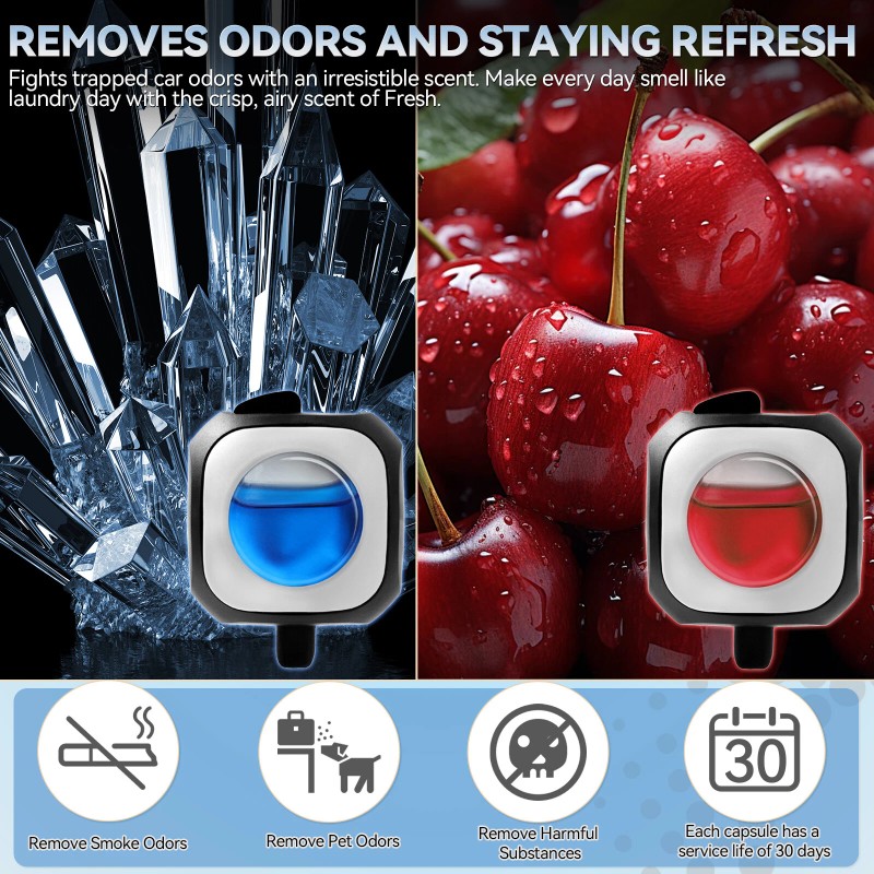 Fresh Cherry and Crystal Ice Car Air Freshener: Infuse your car with a lush and attractive blend of ripe and juicy cherries, evoking a refreshing fruity atmosphere to stimulate your senses during your drive. And Crystal Ice scent like light touch of ocean waves for you to choose.