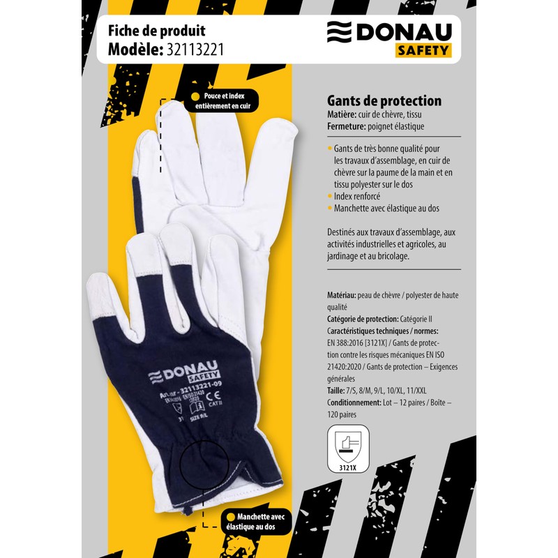- DONAU SAFETY 32113221-10 leather gloves / leather work gloves / assembly gloves with elastic wrist - drawstring. Colour: white-dark blue. Size 10/XL - 1 pair Very high-quality assembly gloves made of goat leather in the grip area and polyester fabric in the upper area.
