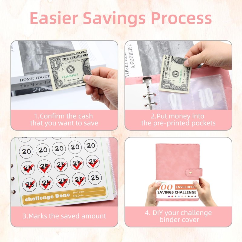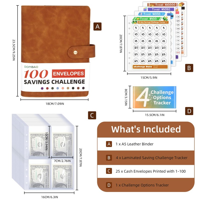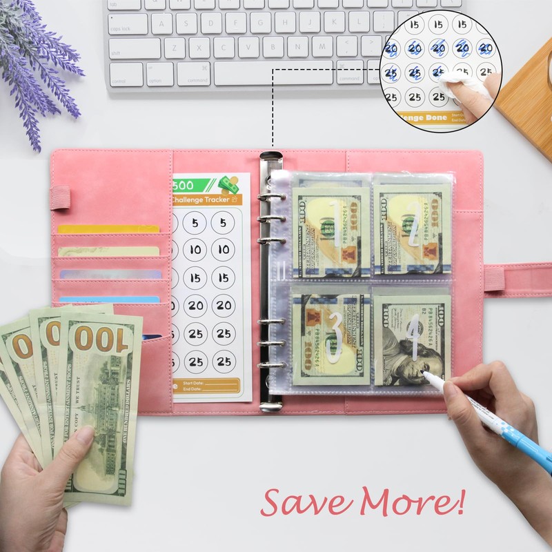 - Money Savings Binder Kit. You will get 2pcs A5 PU leather binder, 2 pack of 25pcs 6-hole cash envelopes pre-printed with 1 to 100, and double of 4pcs challenge tracking sheets for $500, $1000, $5050, and $10,000. Use this money saving binder to help you meet your budget goals.