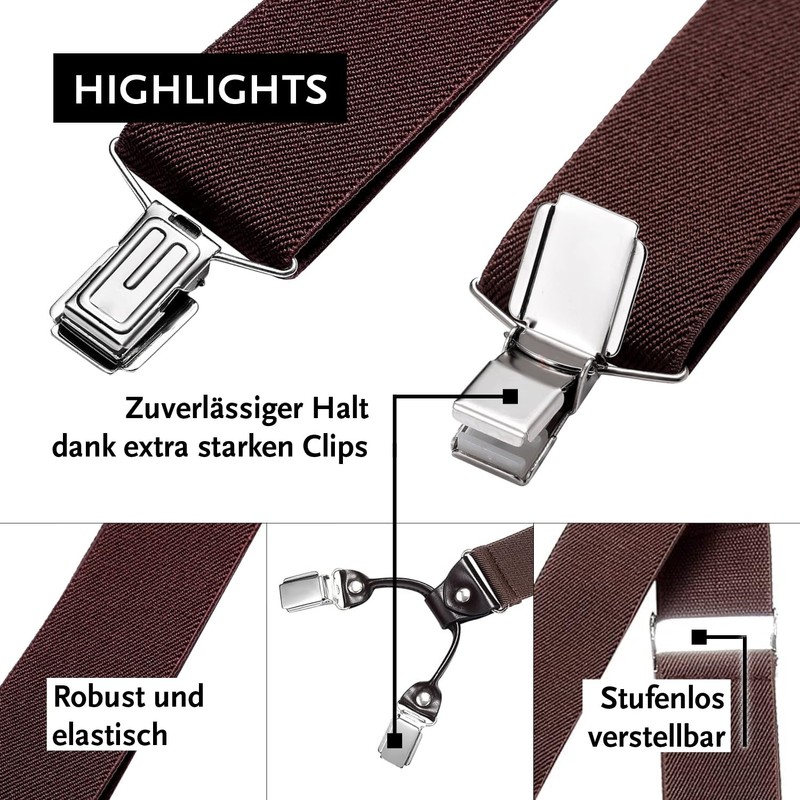 The modern design of the braces, the brown genuine leather appliqué and the very good workmanship make it a reliable companion for your daily tasks. The braces are very comfortable, suitable for all trousers and flexibly adjustable.