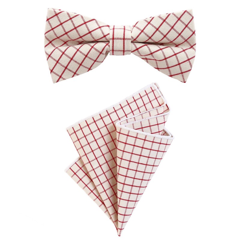 DonDon Men's Pocket Square 23 x 23 cm Set of 2 with Matching Bow Tie 12 x 6 cm Multi-Coloured Cotton Checked, Chequered White and Red