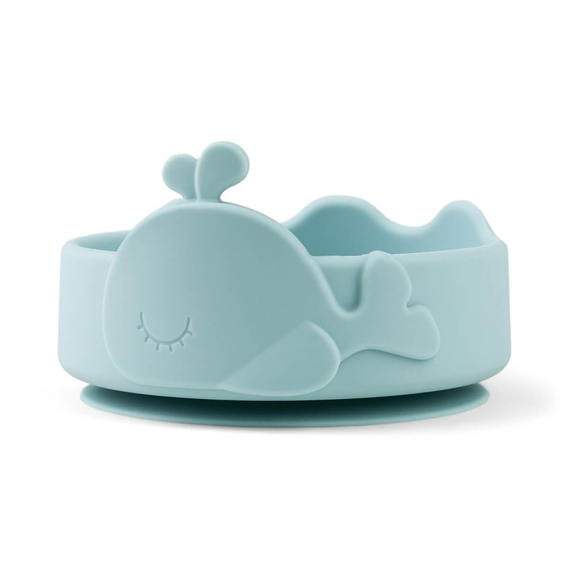 This set is the perfect size for small eaters. Wally floats around the bowl and the tail fin shaped spoon provides good entertainment when dipping into the food. Light pressure makes the bowl stick to most smooth surfaces. The high rim helps with spooning and the spoon can be placed well on the waves. The soft spoon is suitable for both feeding and self-eating. With the playful set in blue, food is fun. Wally is already curious about what is on the menu!