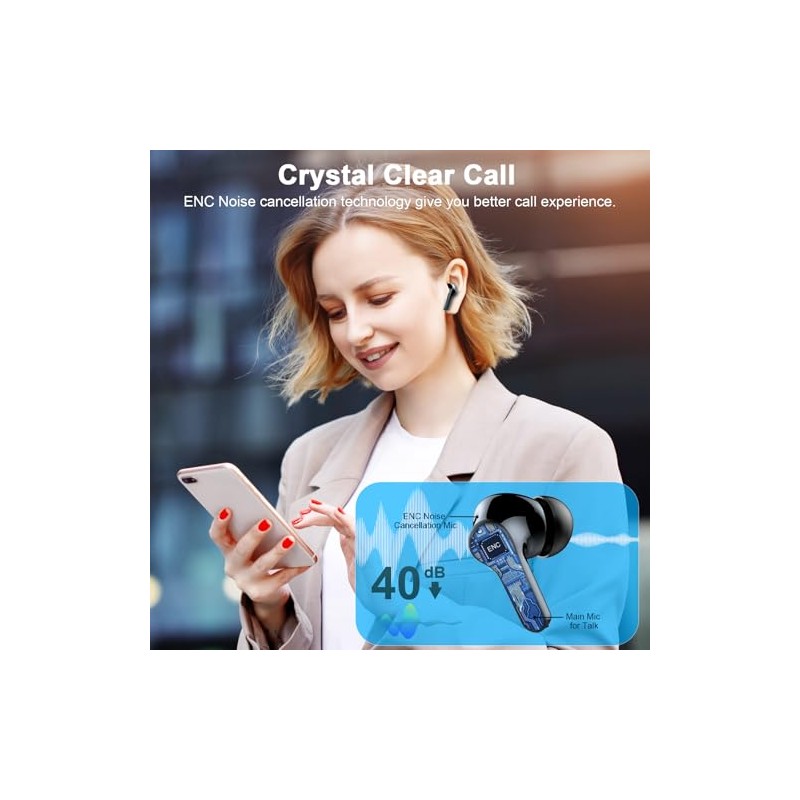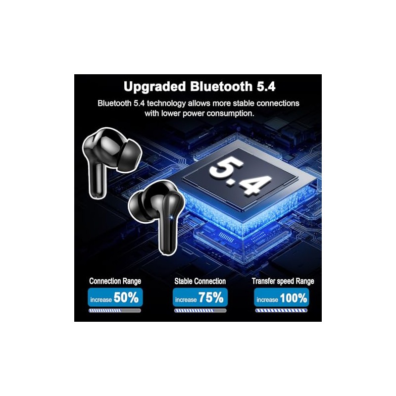 • Immersive Stereo Sound and Superior Clear Call: Bluetooth 5.4 wireless earphones incorporate 13mm double-layer diaphragm drivers, delivering sound with strong bass, clear mids, and bright treble. ENC noise reducing wireless earbuds have built-in 4 high-definition microphones that improve vocals by 75% and 50% more bass. It also ensures high resolution voice recognition and call quality even in noisy environments.Experience hassle free conversations, free from ambient distractions.